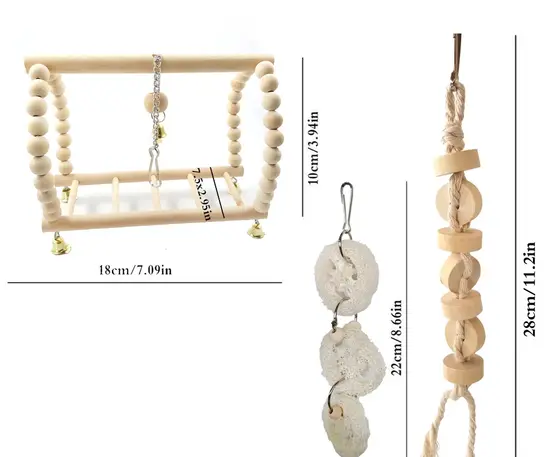 הסט כולל צעצועי נשיכה, תופים תלויים, פעמונים ואלמנטים לעמידה – מגוון שימנע שעמום ויעשיר את יומו של התוכי.
